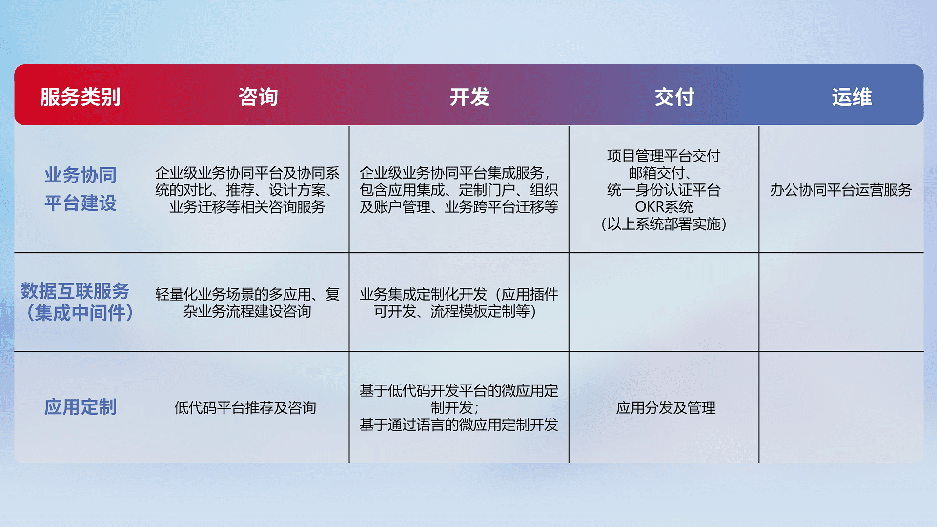 针对钉钉、、企微、、、IDaas等平台级产品提供产品的规划、、、方案、、交付、、定制化开发等服务,,实现如统一协同办公、、、智能客户服务、、、混合会议管理、、、、智能数据查询、、、、等业务场景,,实现数字化转型。。。